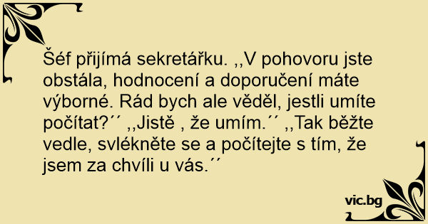 Šéf přijímá sekretářku. ,,V pohovoru jste obstála, hodnocení a doporučení máte výborné. Rád bych ale věděl, jestli umíte počítat?´´ ,,Jistě , že umím.´´ ,,Tak běžte vedle, svlékněte se a počítejte s tím, že jsem za chvíli u vás.´´