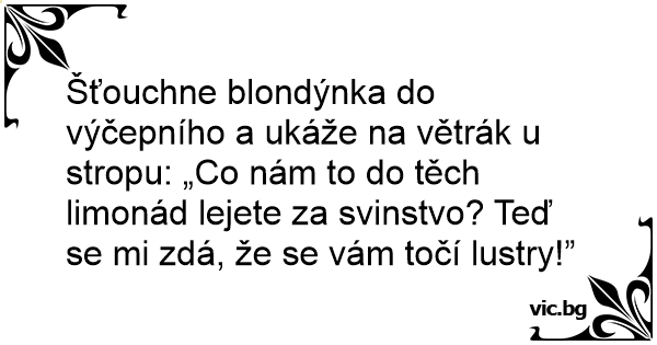 Šťouchne blondýnka do výčepního a ukáže na větrák u stropu: „Co nám to do těch limonád lejete za svinstvo? Teď se mi zdá, že se vám točí lustry!”