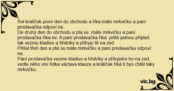 Šel kralíček první den do obchodu a říka:máte mrkvičku a paní prodavačka odpoví:ne.