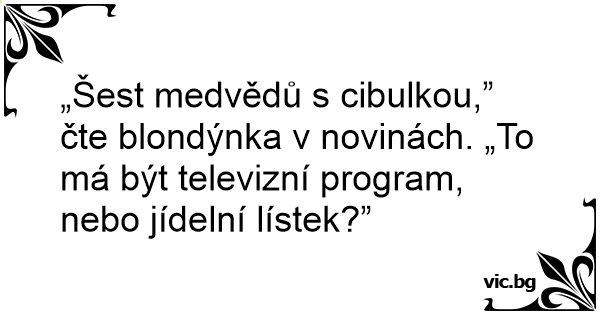 „Šest medvědů s cibulkou,” čte blondýnka v novinách. „To má být televizní program, nebo jídelní lístek?”