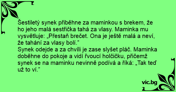 Šestiletý synek přiběhne za maminkou s brekem, že hо jeho malá sestřička tahá za vlasy. Maminka mu vysvětluje: „Přestaň brečet. Ona je ještě malá a neví, že tahání za vlasy bolí.”