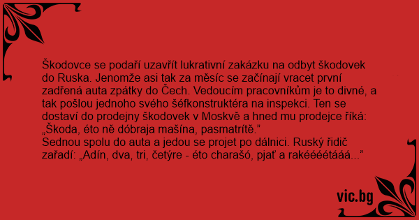 Škodovce se podaří uzavřít lukrativní zakázku na odbyt škodovek do Ruska. Jenomže asi tak za měsíc se začínají vracet první zadřená auta zpátky do Čech. Vedoucím pracovníkům je to divné, a tak pošlou jednoho svého šéfkonstruktéra na inspekci. Ten se dostaví do prodejny škodovek v Moskvě a hned mu prodejce říká: „Škoda, éto ně dóbraja mašína, pasmatrítě.”