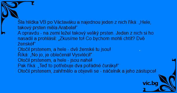Šla hlídka VB po Václaváku a najednou jeden z nich říká: „Hele, takový prsten měla Arabela!”