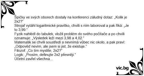 Strojař vytáhl logaritmické pravítko, chvíli s ním laboroval a pak říká: „Je to 3,99.”
