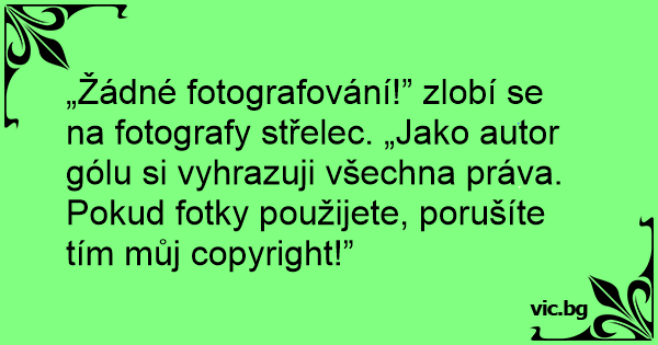 „Žádné fotografování!” zlobí se na fotografy střelec. „Jako autor gólu si vyhrazuji všechna práva. Pokud fotky použijete, porušíte tím můj copyright!”