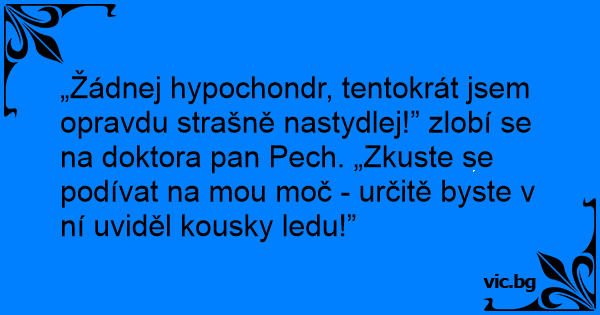 „Žádnej hypochondr, tentokrát jsem opravdu strašně nastydlej!” zlobí se na doktora pan Pech. „Zkuste se podívat na mou moč - určitě byste v ní uviděl kousky ledu!”