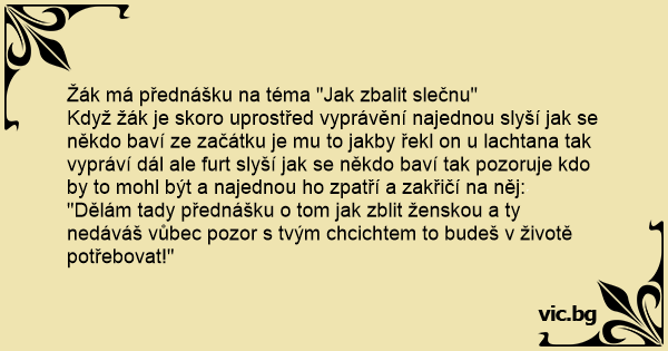 "Dělám tady přednášku o tom jak zblit ženskou a ty nedáváš vůbec pozor s tvým chcichtem to budeš v životě potřebovat!"