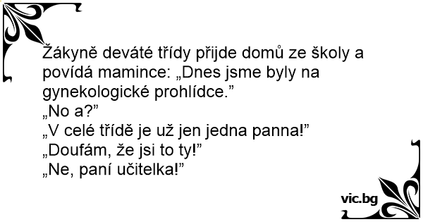 Egy nyolcadik osztályos kislány meséli a szüleinek: - Ma bejött egy nőgyógyász az iskolába és mindenkit megvizsgált. Képzeljétek, csak egyetlen lány szűz még az egész osztályban. - Biztos te vagy...