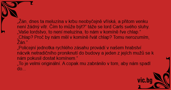 „Žán, dnes ta meluzína v krbu neobyčejně vříská, a přitom venku není žádný vítr. Čím to může být?” táže se lord Carls svého sluhy.