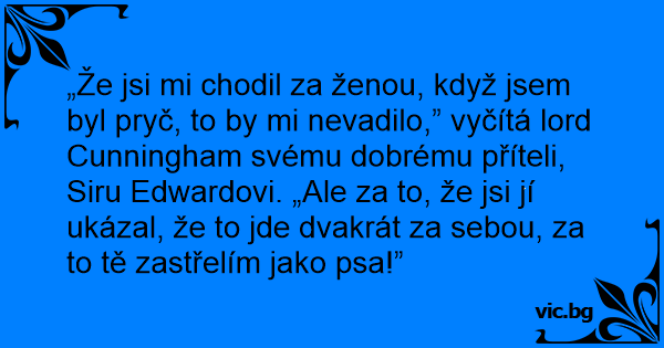 „Že jsi mi chodil za ženou, když jsem byl pryč, to by mi nevadilo,” vyčítá lord Cunningham svému dobrému příteli, Siru Edwardovi. „Ale za to, že jsi jí ukázal, že to jde dvakrát za sebou, za to tě zastřelím jako psa!”