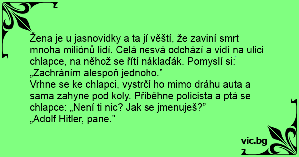 Žena je u jasnovidky a ta jí věští, že zaviní smrt mnoha miliónů lidí. Celá nesvá odchází a vidí na ulici chlapce, na něhož se řítí náklaďák. Pomyslí si: „Zachráním alespoň jednoho.”