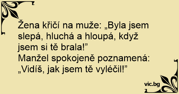 Manžel spokojeně poznamená: „Vidíš, jak jsem tě vyléčil!”