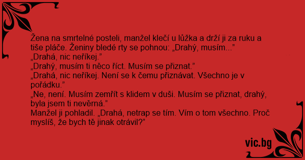 Manžel ji pohladil. „Drahá, netrap se tím. Vím o tom všechno. Proč myslíš, že bych tě jinak otrávil?”