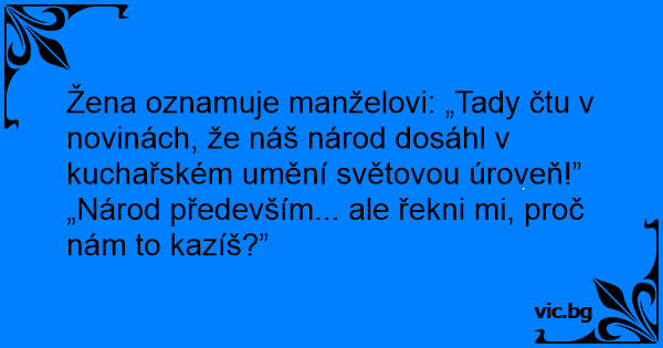 Žena oznamuje manželovi: „Tady čtu v novinách, že náš národ dosáhl v kuchařském umění světovou úroveň!”