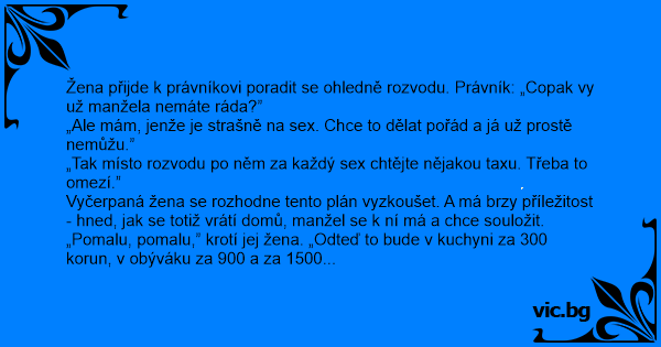 Žena přijde k právníkovi poradit se ohledně rozvodu. Právník: „Copak vy už manžela nemáte ráda?”
