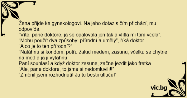 Žena přijde ke gynekologovi. Na jeho dotaz s čím přichází, mu odpovídá: