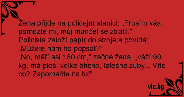 Žena přijde na policejní stanici: „Prosím vás, pomozte mi, můj manžel se ztratil.”