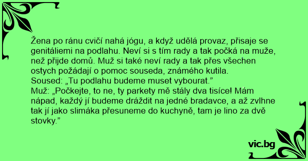 Muž: „Počkejte, to ne, ty parkety mě stály dva tisíce! Mám nápad, každý jí budeme dráždit na jedné bradavce, a až zvlhne tak jí jako slimáka přesuneme do kuchyně, tam je lino za dvě stovky.”