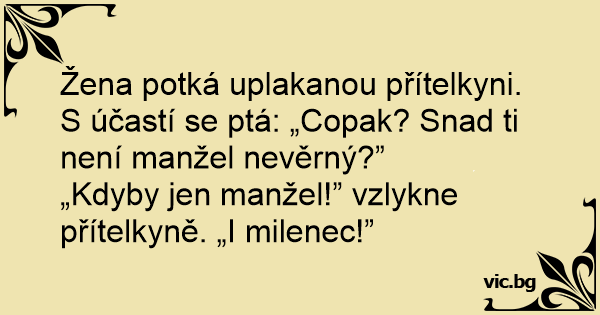 Žena potká uplakanou přítelkyni. S účastí se ptá: „Copak? Snad ti není manžel nevěrný?”