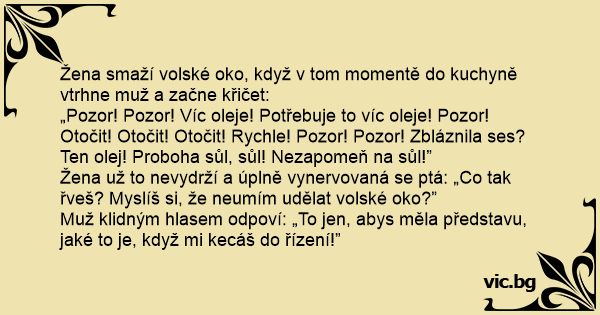 Žena už to nevydrží a úplně vynervovaná se ptá: „Co tak řveš? Myslíš si, že neumím udělat volské oko?”