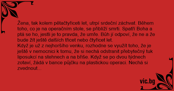 Žena, tak kolem pětačtyřiceti let, utrpí srdeční záchvat. Během toho, co je na operačním stole, se přiblíží smrti. Spatří Boha a ptá se hо, jestli je to pravda, že umře. Bůh jí odpoví, že ne a že bude žít ještě dalších třicet nebo čtyřicet let.