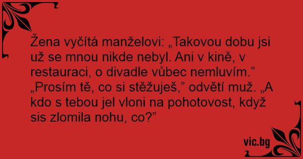 „Prosím tě, co si stěžuješ,” odvětí muž. „A kdo s tebou jel vloni na pohotovost, když sis zlomila nohu, co?”