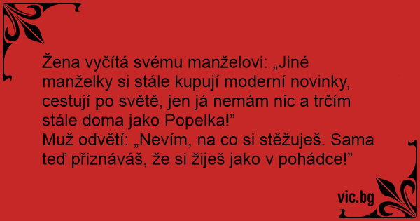 Muž odvětí: „Nevím, na co si stěžuješ. Sama teď přiznáváš, že si žiješ jako v pohádce!”