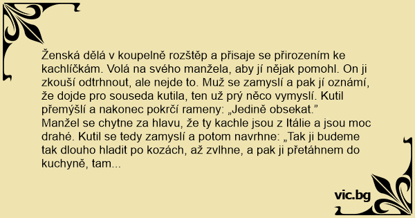 Manžel se chytne za hlavu, že ty kachle jsou z Itálie a jsou moc drahé. Kutil se tedy zamyslí a potom navrhne: „Tak ji budeme tak dlouho hladit po kozách, až zvlhne, a pak ji přetáhnem do kuchyně, tam jsou kachlíčky levnější!”