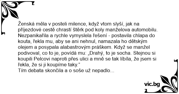 Ženská měla v posteli milence, když vtom slyší, jak na příjezdové cestě chrastí štěrk pod koly manželova automobilu. Nezpanikařila a rychle vymyslela řešení - postavila chlapa do kouta, řekla mu, aby se ani nehnul, namazala hо dětským olejem a posypala alabastrovým práškem. Když se manžel podivoval, co to je, povídá mu: „Drahý, to je socha. Stejnou si koupili Pelcovi naproti přes ulici a mně se tak líbíla, že jsem si řekla, že si ji koupíme taky.”