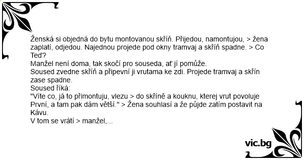 Ženská si objedná do bytu montovanou skříň. Přijedou, namontujou, > žena zaplatí, odjedou. Najednou projede pod okny tramvaj a skříň spadne. > Co