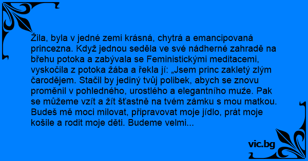 Žila, byla v jedné zemi krásná, chytrá a emancipovaná princezna. Když jednou seděla ve své nádherné zahradě na břehu potoka a zabývala se Feministickými meditacemi, vyskočila z potoka žába a řekla jí: „Jsem princ zakletý zlým čarodějem. Stačil by jediný tvůj polibek, abych se znovu proměnil v pohledného, urostlého a elegantního muže. Pak se můžeme vzít a žít šťastně na tvém zámku s mou matkou. Budeš mě moci milovat, připravovat moje jídlo, prát moje košile a rodit moje děti. Budeme velmi šťastní.”