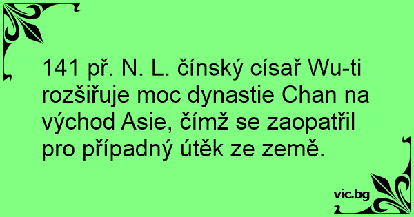 141 př. N. L. čínský císař Wu-ti rozšiřuje moc dynastie Chan na východ Asie, čímž se zaopatřil pro případný útěk ze země.