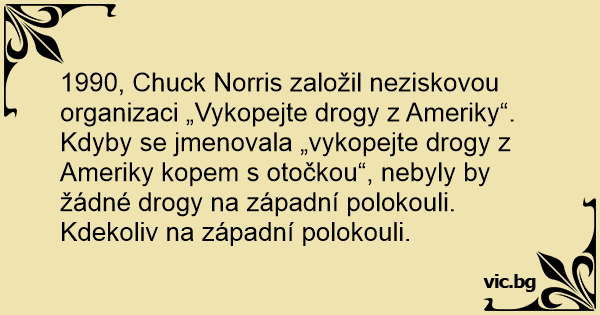 1990, Chuck Norris založil neziskovou organizaci „Vykopejte drogy z Ameriky“. Kdyby se jmenovala „vykopejte drogy z Ameriky kopem s otočkou“, nebyly by žádné drogy na západní polokouli. Kdekoliv na západní polokouli.