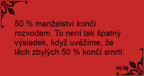 50 % manželství končí rozvodem. To není tak špatný výsledek, když uvážíme, že těch zbylých 50 % končí smrtí.