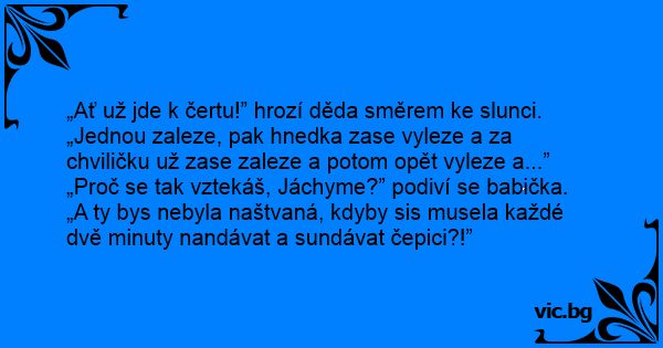 „Ať už jde k čertu!” hrozí děda směrem ke slunci. „Jednou zaleze, pak hnedka zase vyleze a za chviličku už zase zaleze a potom opět vyleze a...”