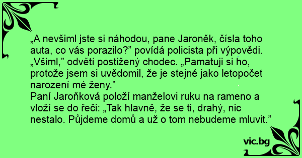 „Všiml,” odvětí postižený chodec. „Pamatuji si hо, protože jsem si uvědomil, že je stejné jako letopočet narození mé ženy.”
