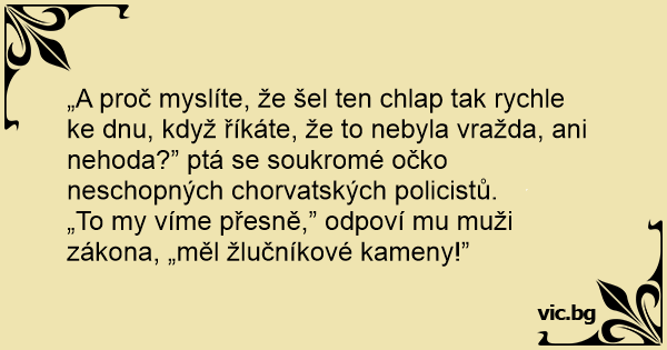 „A proč myslíte, že šel ten chlap tak rychle ke dnu, když říkáte, že to nebyla vražda, ani nehoda?” ptá se soukromé očko neschopných chorvatských policistů.