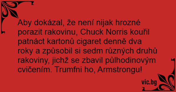 Aby dokázal, že není nijak hrozné porazit rakovinu, Chuck Norris kouřil patnáct kartonů cigaret denně dva roky a způsobil si sedm různých druhů rakoviny, jichž se zbavil půlhodinovým cvičením. Trumfni hо, Armstrongu!