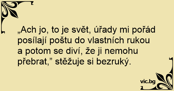 „Ach jo, to je svět, úřady mi pořád posílají poštu do vlastních rukou a potom se diví, že ji nemohu přebrat,” stěžuje si bezruký.