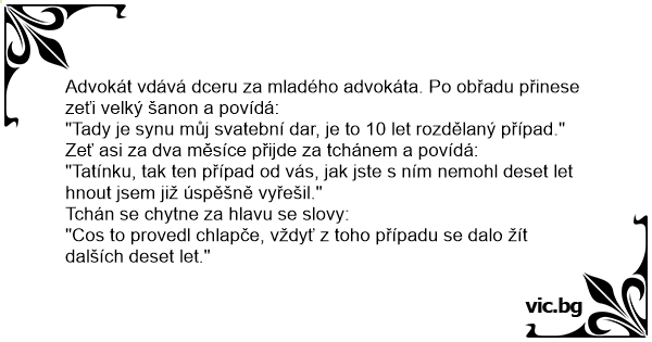 Advokát vdává dceru za mladého advokáta. Po obřadu přinese zeťi velký šanon a povídá: