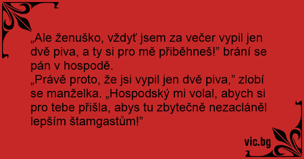 „Právě proto, že jsi vypil jen dvě piva,” zlobí se manželka. „Hospodský mi volal, abych si pro tebe přišla, abys tu zbytečně nezacláněl lepším štamgastům!”