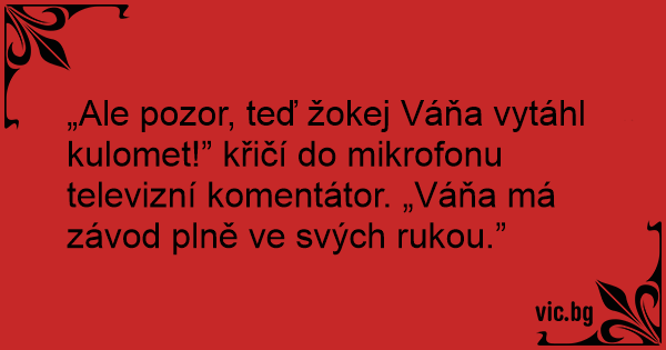 „Ale pozor, teď žokej Váňa vytáhl kulomet!” křičí do mikrofonu televizní komentátor. „Váňa má závod plně ve svých rukou.”
