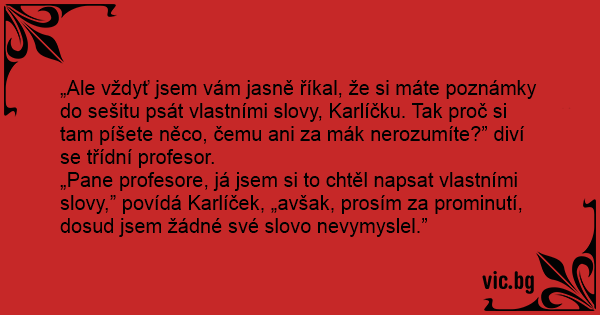 „Ale vždyť jsem vám jasně říkal, že si máte poznámky do sešitu psát vlastními slovy, Karlíčku. Tak proč si tam píšete něco, čemu ani za mák nerozumíte?” diví se třídní profesor.