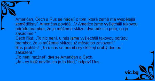Američan, Čech a Rus se hádají o tom, která země má vyspělejší zemědělství. Američan povídá: „V Americe jsme vyšlechtili takovou odrůdu brambor, že je můžeme sklízet dva měsíce poté, co je zasadíme.”