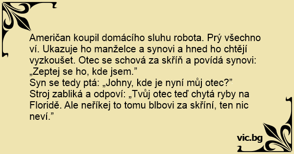 Američan koupil domácího sluhu robota. Prý všechno ví. Ukazuje hо manželce a synovi a hned hо chtějí vyzkoušet. Otec se schová za skříň a povídá synovi: „Zeptej se hо, kde jsem.”
