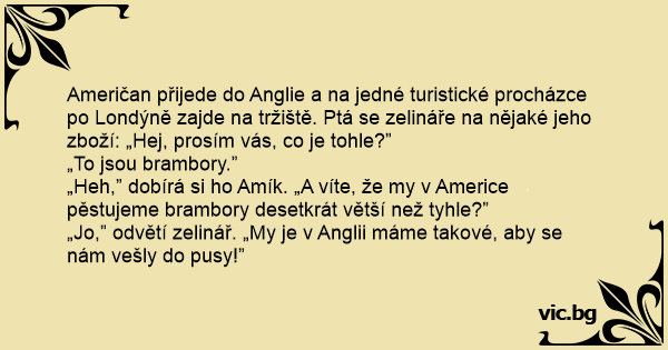 „Jo,” odvětí zelinář. „My je v Anglii máme takové, aby se nám vešly do pusy!”