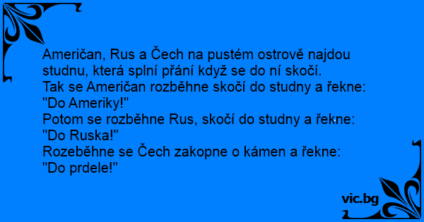 Američan, Rus a Čech na pustém ostrově najdou studnu, která splní přání když se do ní skočí.