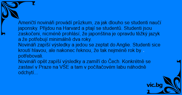 Novináři opět zapíší výsledky a zamíří do Čech. Konkrétně se zastaví v Praze na VŠE a tam v počítačovém labu náhodně odchytí pár studentů a zase se ptají, za jak dlouho by se naučili japonsky. Ekonom s trochu červenýma očima se ptá: „Prosím vás, a jsou na to skripta?”