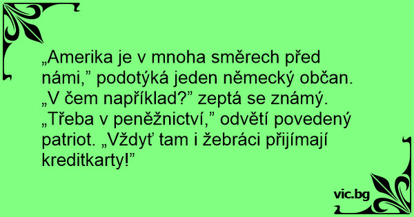 „Třeba v peněžnictví,” odvětí povedený patriot. „Vždyť tam i žebráci přijímají kreditkarty!”