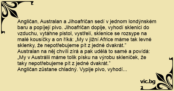 Angličan, Australan a Jihoafričan sedí v jednom londýnském baru a popíjejí pivo. Jihoafričan dopije, vyhodí sklenici do vzduchu, vytáhne pistol, vystřelí, sklenice se rozsype na malé kousíčky a on říká: „My v jižní Africe máme tak levné sklenky, že nepotřebujeme pít z jedné dvakrát.”